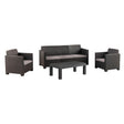 El conjunto de jardín Belice elaborado con materiales reciclados, aporta comodidad y elegancia con su estilo contemporáneo. Su textura de trenzado de ratán le dan distinción. Incluye sofá de 3 plazas, dos sillones individuales y mesa baja. Es resistente a los rayos UV y a las variaciones climáticas.